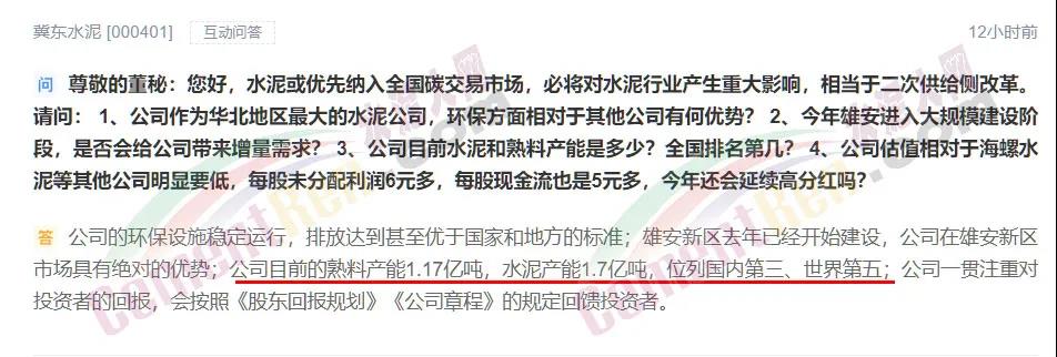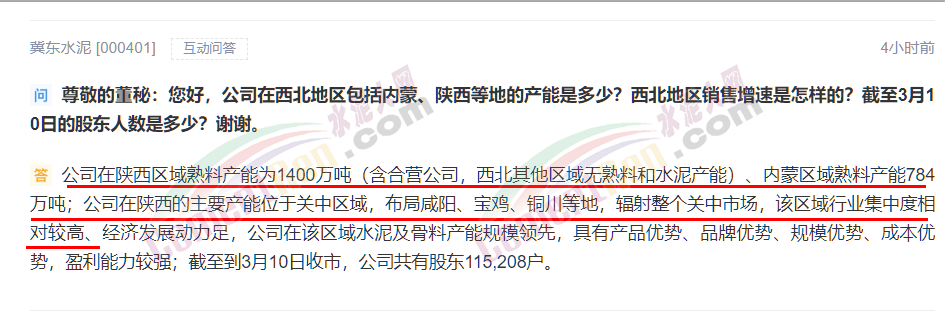 另有投资者提问关于西北地区的内蒙和陕西产能,冀东水泥上市公司回复称, 公司在陕西区域熟料产能为1400万吨(含合营公司,西北其他区域无熟料和水泥产能)、内蒙区域熟料产能784万吨;