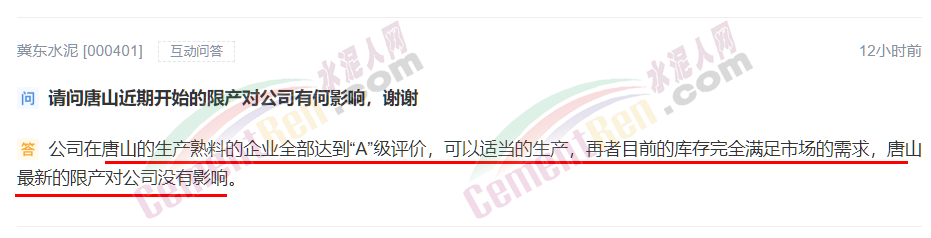 冀东水泥回复称,公司在唐山的生产熟料的企业全部达到“A”级评价,可以适当的生产,再者目前的库存完全满足市场的需求,唐山最新的限产对公司没有影响。