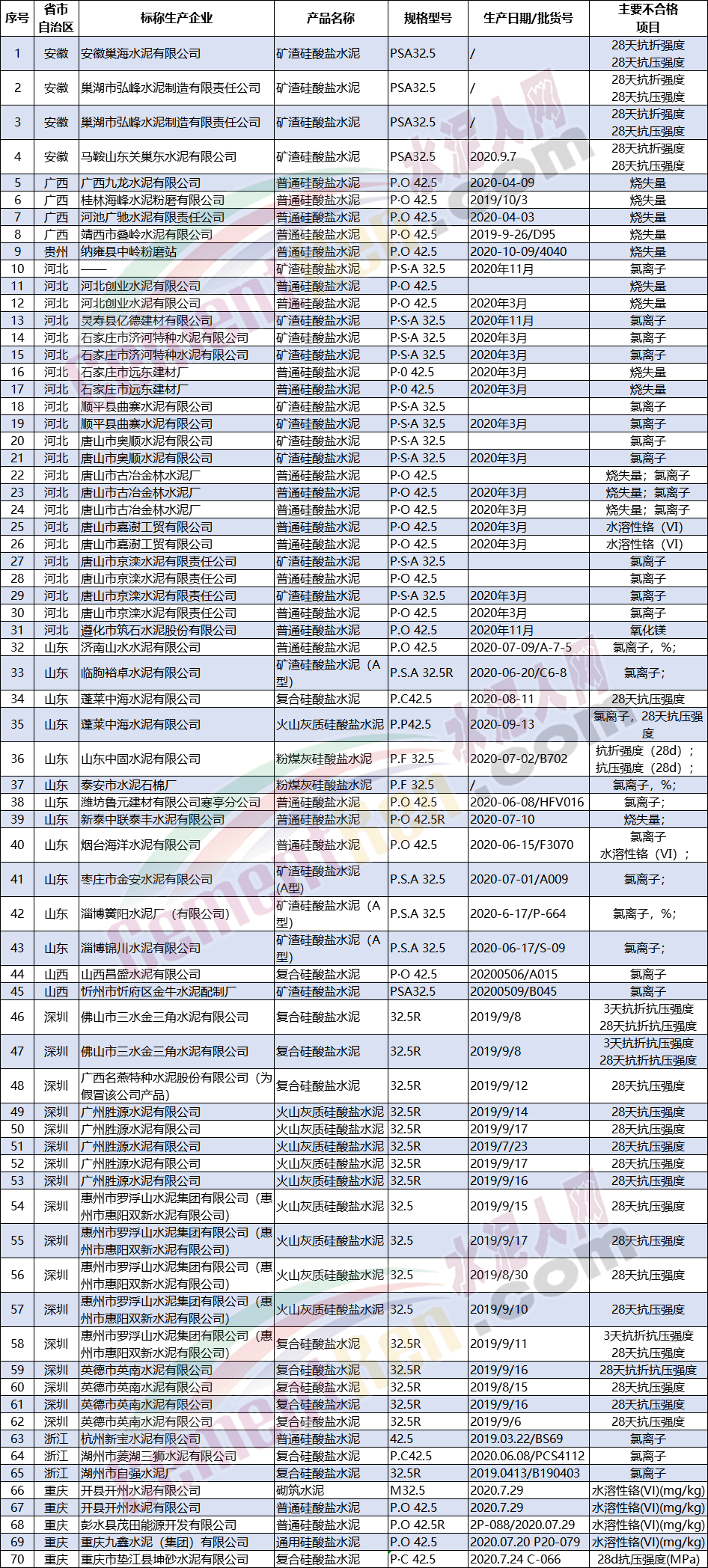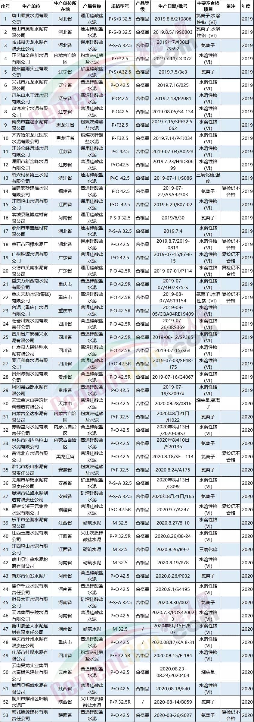 从近两年多个省市自治区通报的不合格产品结果可见不仅包括部分企业生产的32.5等级标号水泥也包括42.5等级的普遍硅酸盐水泥。不合格项目不仅包括抗压,抗折强度,氯离子,也包括水溶性铬以及烧失量等多个项目,可见水泥质量的问题与标号无关,极有可能与企业所用的材料以及生产工艺有关。