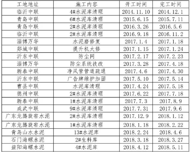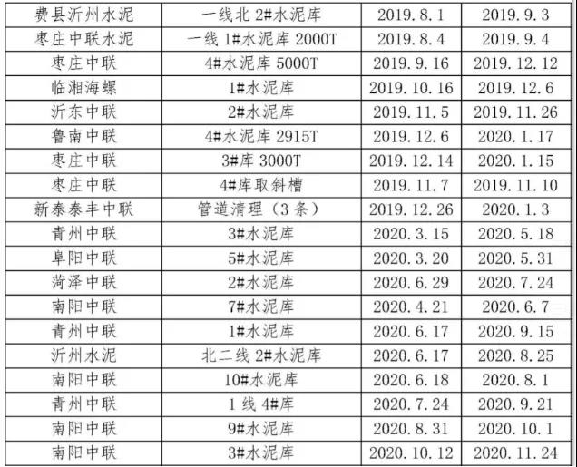 从首次清库至今,鑫盛利共清理几百个储存库,针对不同区域、气候、库型、施工现场工况作出相应的方案,并且做到一库一档方便后期维护及再次清理时查阅。现已进入成熟的清库阶段,并稳步发展,与中联、海螺、山水、沂州等水泥企业达成了战略合作,为水泥企业的安全高效清库提供了保障。