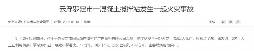 广东省应急管理厅消息,3月12日16时06分,位于广东省云浮罗定市围底镇宦塘村的广东润坚有限公司混凝土搅拌站发生一起火灾,造成2人死亡。经初步了解,事发时,3名工人正在利用简易油泵装卸作业,导致油泵着火。17时许,明火扑灭,过火面积约20平方米,主要燃烧物为柴油。