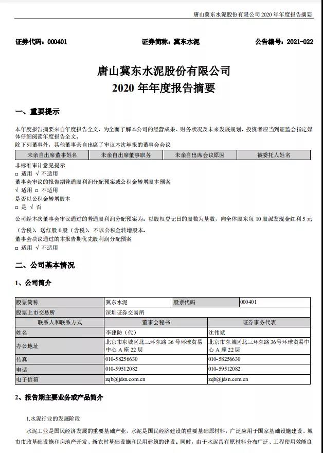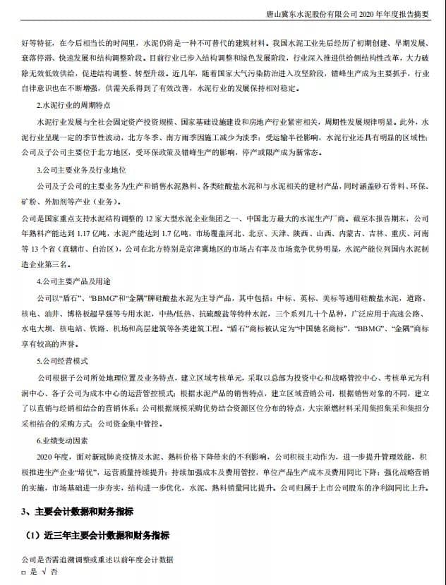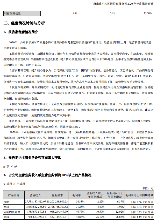 2020 年度,面对新冠肺炎疫情及水泥、熟料价格下降带来的不利影响,公司积极主动作为,进一步提升管理效能,积极推进生产企业“培优”,运营质量持续提升;持续加强成本及费用管控,单位产品生产成本及费用同比下降;强化战略营销的实施,市场基础进一步夯实,结构进一步优化,水泥、熟料销量同比提升。公司归属于上市公司股东的净利润同比上升。