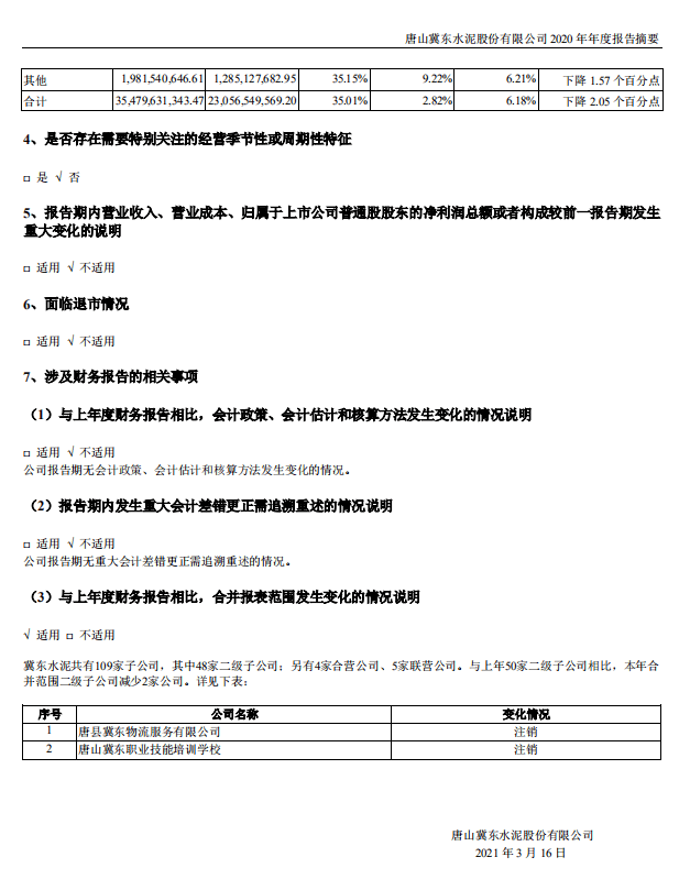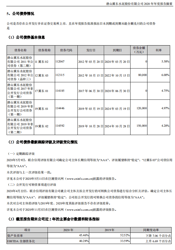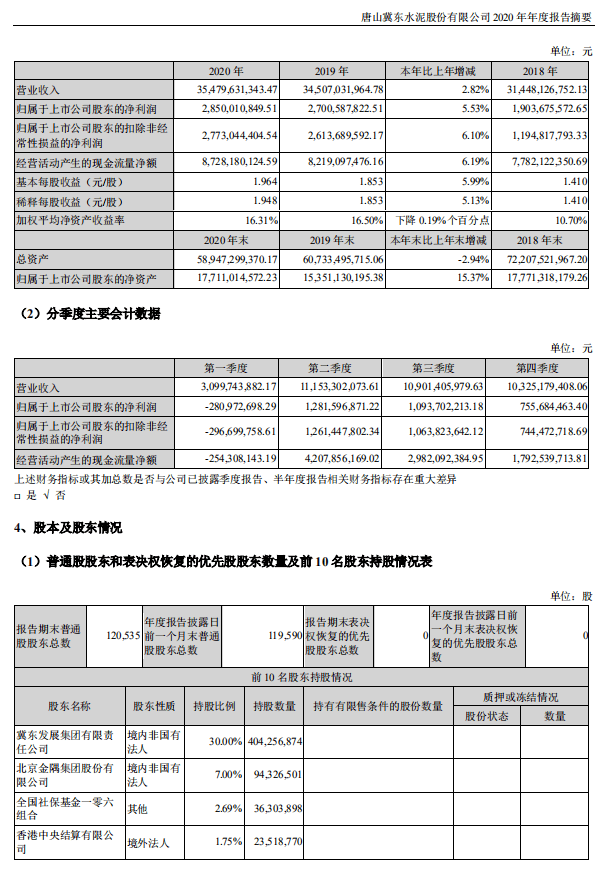 3月16日,冀东水泥发布了2020年年报。公司实现营业收入354.8亿元,同比增长2.82%;净利润28.5亿元,同比增长5.53%。公司水泥及熟料综合销量10733万吨,同比增长11.33%。