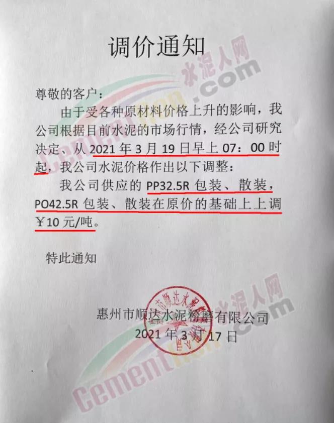 华南珠三角区域主要品牌企业熟料预上调20元/吨,水泥价格或应声而涨。日前,惠州市顺达水泥粉磨有限公司通知,由于受各种原材料价格上升的影响,公司研究决定从2021年3月19日早上7时起,公司供应的 PP32.5R包装、散装,PO42.5R包装、散装在原价的基础上上调10 元/吨。
