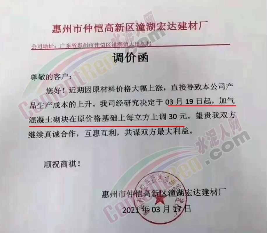 同日,惠州区域多家混凝土加气砖厂陆续通知上调产品价格30元/立方。惠州市仲恺高新区潼湖宏达建材厂公司通知,因原材料价格大幅上涨,直接导致公司产品生产成本的上升。经研究决定于3月19 日起,加气混凝土砌块在原价格基础上上调 30元/立方。