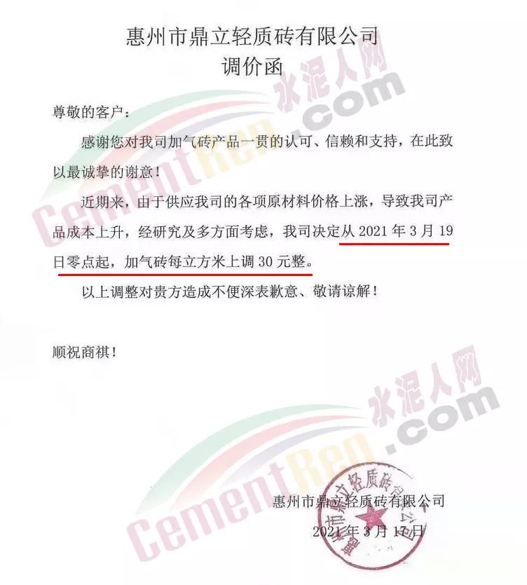 惠州市鼎立轻质砖有限公司通知,由于供应我司的各项原材料价格上涨,导致公司产品成本上升,经研究及多方面考虑,决定从2021年3月19日零点起,加气砖上调 30 元/立方。