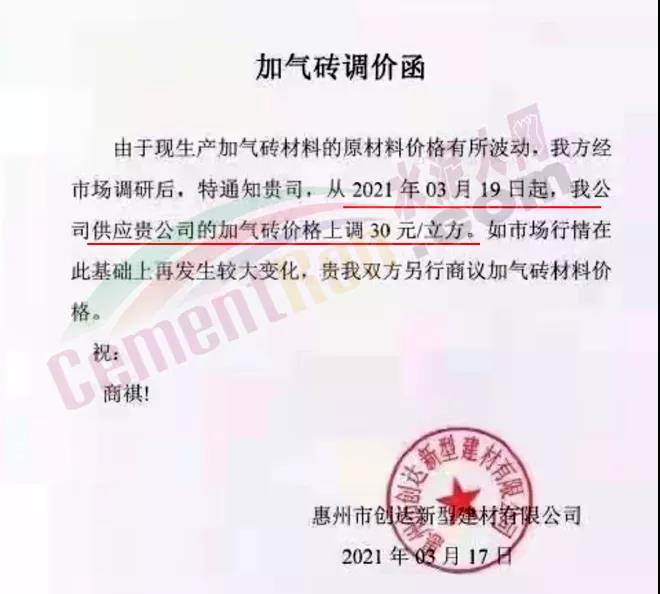 惠州市创达新型建材有限公司通知,由于现生产加气砖材料的原材料价格有所波动,从2021年 03月19日起,公司供应贵公司的加气砖价格上调 30元/立方。