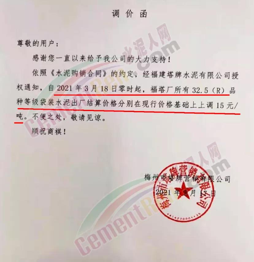 梅州市塔牌营销有限公司通知,自3月18日零时起,福塔厂所有32.5(R)品种等级袋装水泥出厂结算价格分别 在现行价格基础上上调15元/吨。