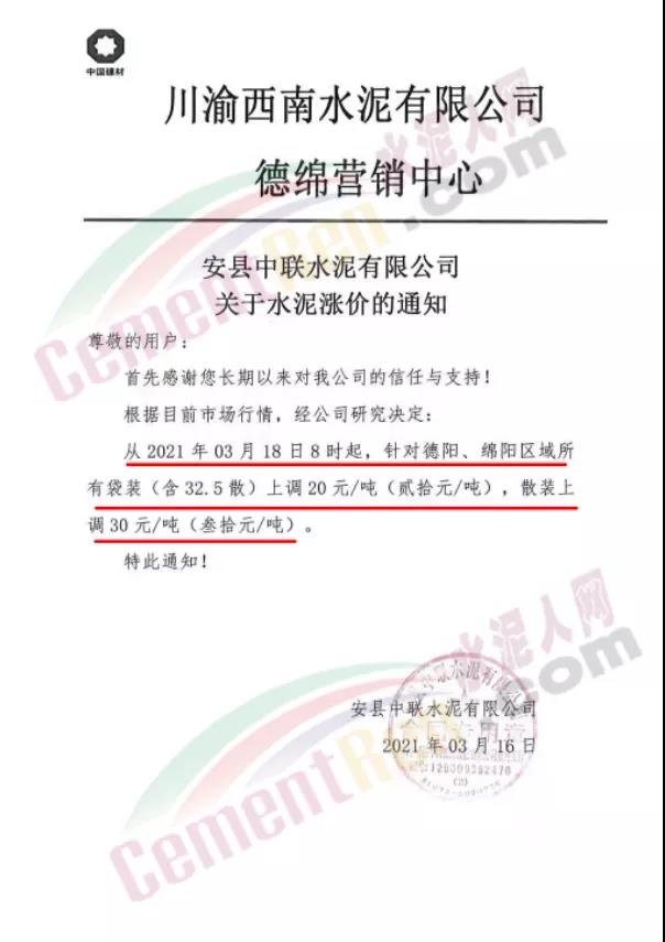 西南区域主要品牌企业也陆续发布调价通知,多企业表示近期以“复价增量”为主。中国建材川渝西南水泥有限公司德绵营销中心安县中联水泥有限公司水泥涨价通知称,从2021年03月18日8时起,针对德阳、绵阳区域所有袋装(含32.5散)上调20元/吨,散装上调30元/吨。