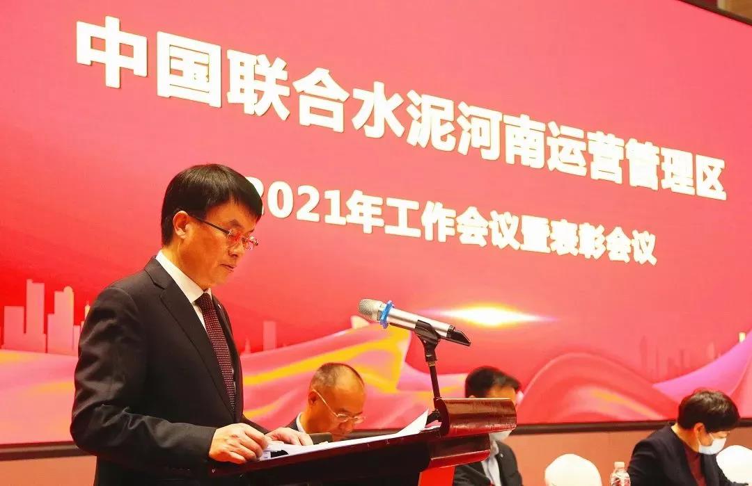 3月16日,中国联合水泥河南运营管理区2021年工作会议暨表彰会议在郑州召开。中国建材股份执行董事、副总裁,中国联合水泥党委书记、董事长崔星太出席会议并做重要讲话。中国联合水泥党委副书记、总经理孙建成,党委副书记武玉金,河南省建筑材料工业协会会长王爱贞出席会议。中国联合水泥副总经理、河南区总裁刘宗虎作了题为《抢抓机遇 加快布局 奋力推进河南区高质量发展》的工作报告,河南区财务总监李学功主持会议。