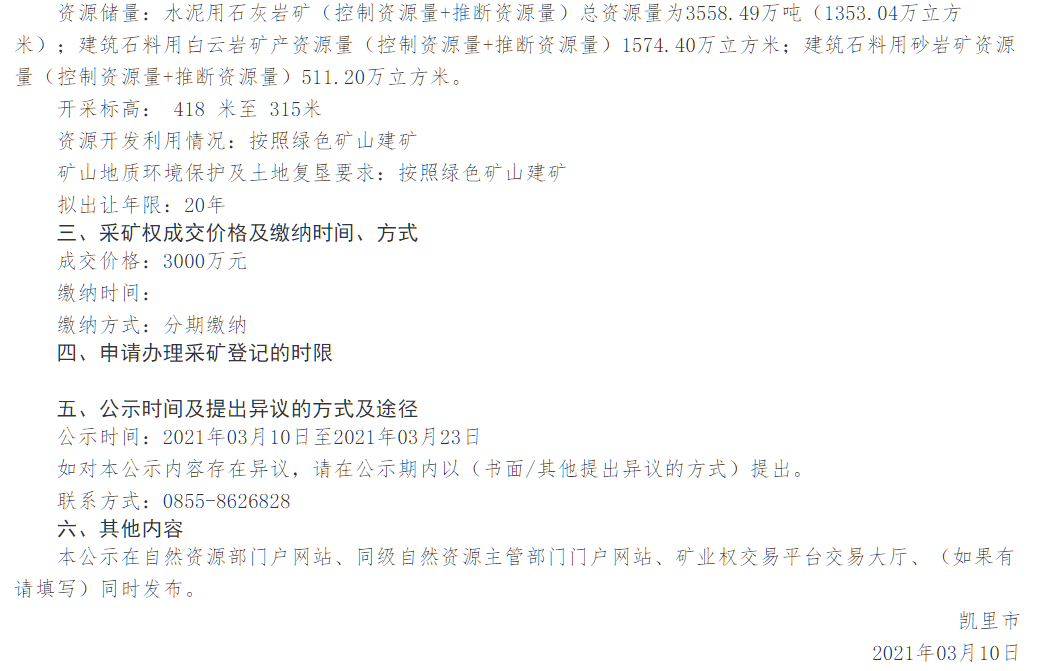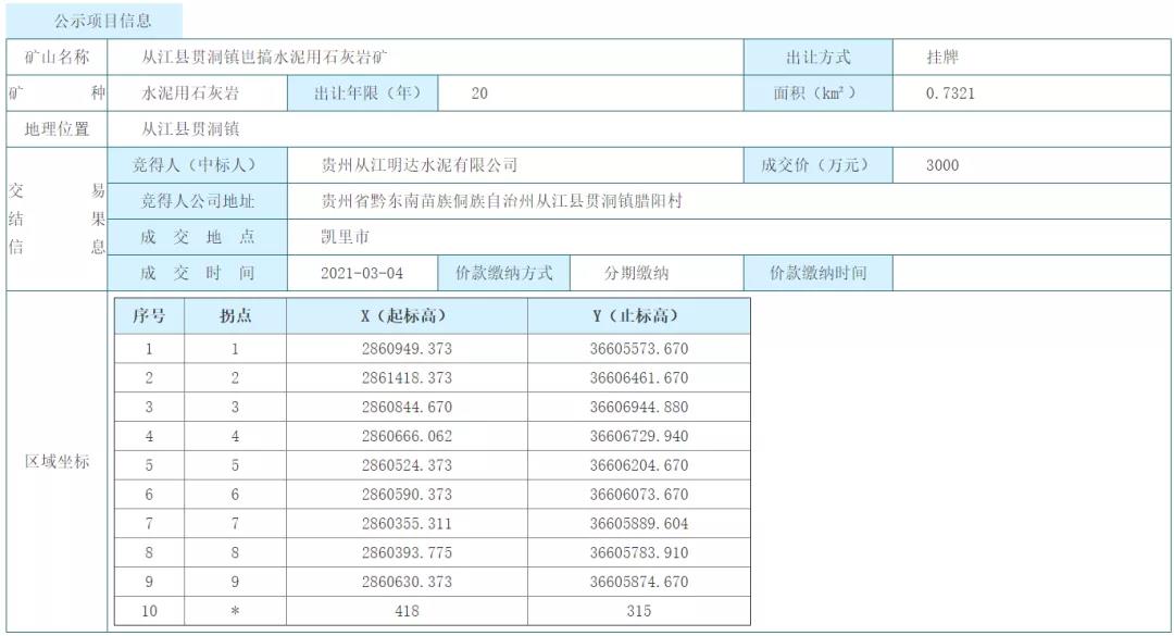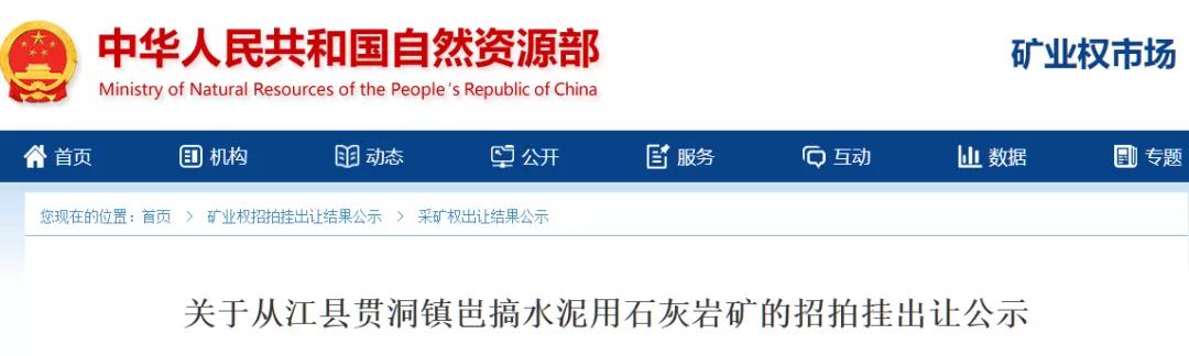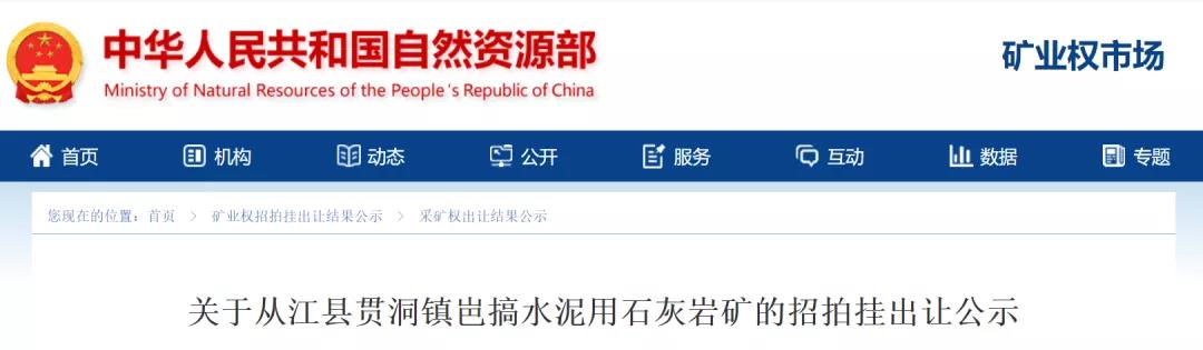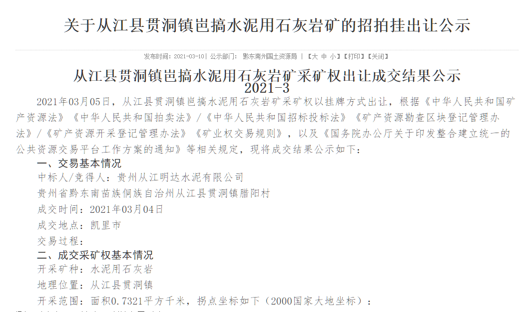 日前,自然资源部网站发布“从江县贯洞镇岜搞水泥用石灰岩矿采矿权出让成交结果公示”。公示显示,贵州从江明达水泥有限公司以3000万元拍得一处水泥用石灰岩采矿权。