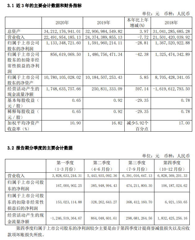 日前,中材国际(600970.SH)2020年年度报告,实现营业收入224.92亿元,同比减少7.72%;归属于上市公司股东的净利润11.33亿元,同比减少28.81%;归属于上市公司股东的扣除非经常性损益的净利润8.57亿元,同比下降42.38%;基本每股收益0.65元,拟每10股派发现金红利2.3元(含税)。