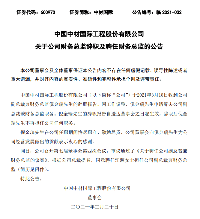 公司于3月19日晚间披露关于公司财务总监辞职及聘任财务总监的公告称,倪金瑞辞去公司副总裁兼财务总监职务,聘任汪源担任公司副总裁兼财务总监。