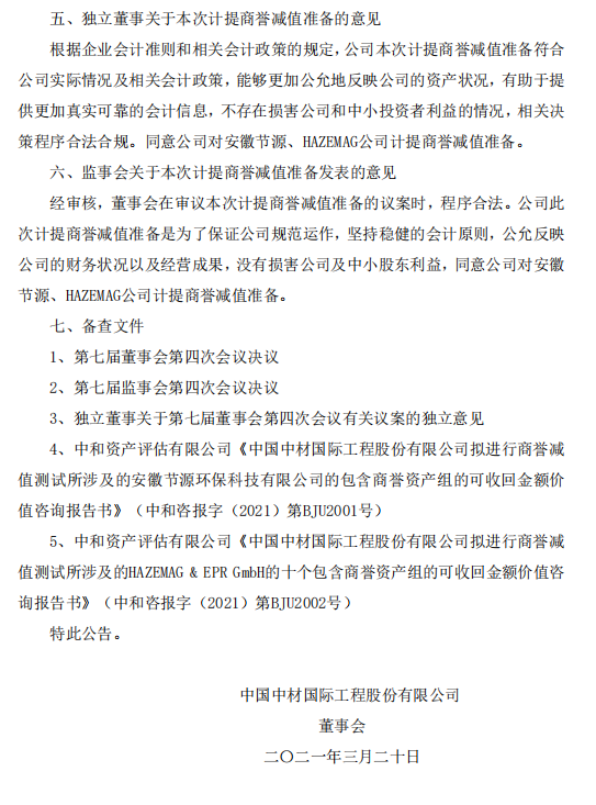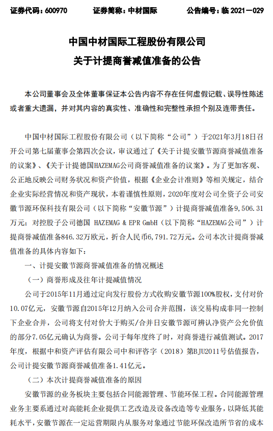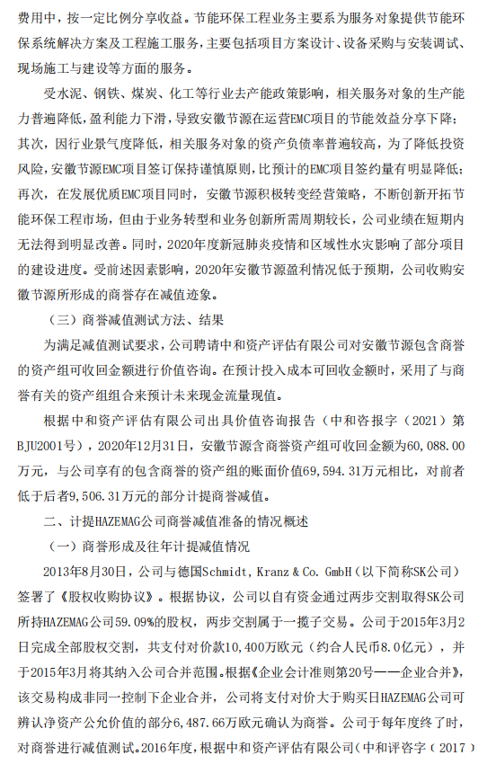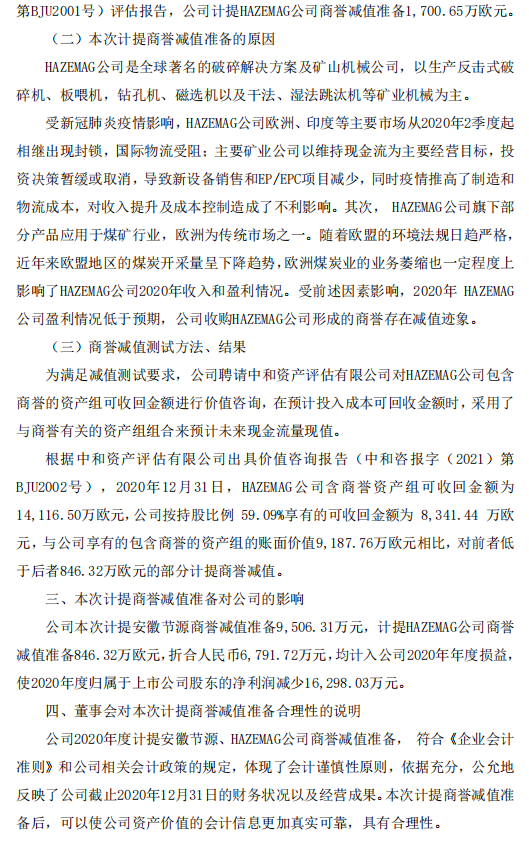 公司同期公告,公司对全资子公司安徽节源环保科技有限公司(“安徽节源”)计提商誉减值准备9506.31万元,对控股子公司德国HAZEMAG EPR GmbH(“HAZEMAG公司”)计提商誉减值准备846.32万欧元,折合人民币6791.72万元,均计入公司2020年年度损益,使2020年度归属于上市公司股东的净利润减少1.63亿元。