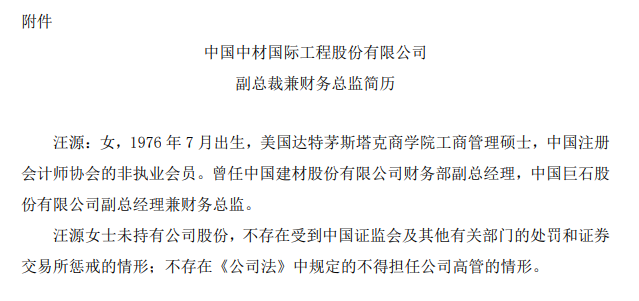 汪源:女,1976年7月出生,美国达特茅斯塔克商学院工商管理硕士,中国注册会计师协会的非执业会员。曾任中国建材股份有限公司财务部副总经理,中国巨石股份有限公司副总经理兼财务总监。