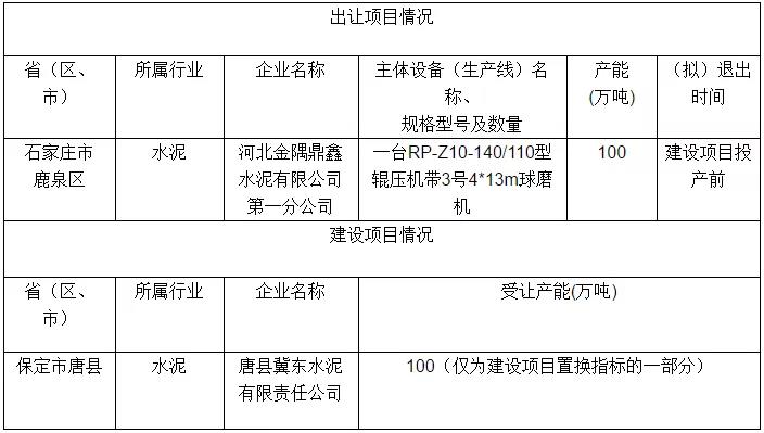 日前,石家庄市工信局发布了《关于河北金隅鼎鑫水泥有限公司水泥粉磨产能出让方案的公告》称,河北金隅鼎鑫水泥有限公司将出让100万吨水泥粉磨产能用于唐县冀东水泥有限责任公司新建生产线。受让产能仅为新建生产线产能指标中的一部分。 河北金隅鼎鑫水泥有限公司水泥粉磨产能出让方案 据查询,唐县冀东水泥有限责任公司生产地址位于河北省保定市唐县白合镇白合村,为全能水泥厂,企业目前拥有一条熟料生产线和两条粉磨生产线,关键设备分别为:Φ4.8×72m回转窑1台,Φ4.8×9.5m水泥磨2台。