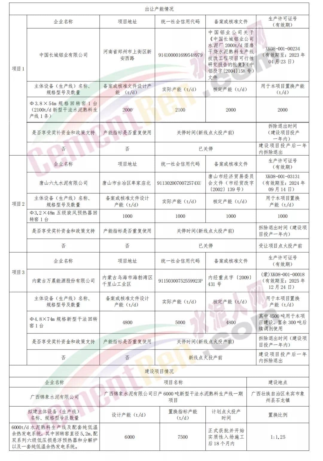 对广西锦象水泥有限公司日产6000吨新型干法水泥熟料生产线一期项目产能置换方案(详见附件1)的合法性、合规性,置换指标的真实性情况听取各方面的意见和建议。