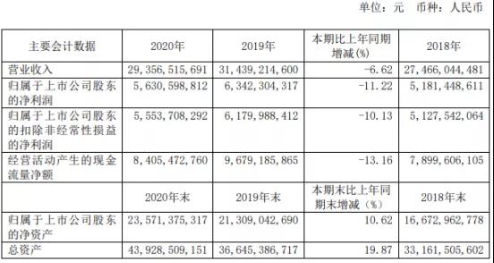 公告披露显示经董事会审议的报告期利润分配预案或公积金转增股本预案:2020年度,母公司实现净利润为3,155,313,737元,合并后归属于母公司股东的净利润为5,630,598,812元。截止2020年12月31日母公司可供分配利润为7,370,600,800元。