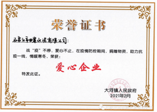 疫情无情,人间有爱,为弘扬正能量,充分发挥先进典型作用,2021年3月25日,大河镇人民政府举办2020年抗击疫情表彰会。石家庄市曲寨水泥获得“抗疫爱心企业”称号。