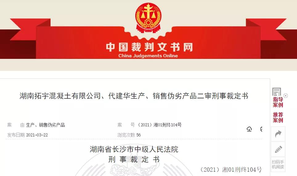 日前,湖南省长沙市中级人民法院对“湖南拓宇混凝土有限公司、代建华生产、销售伪劣产品”案件作出二审刑事裁定。