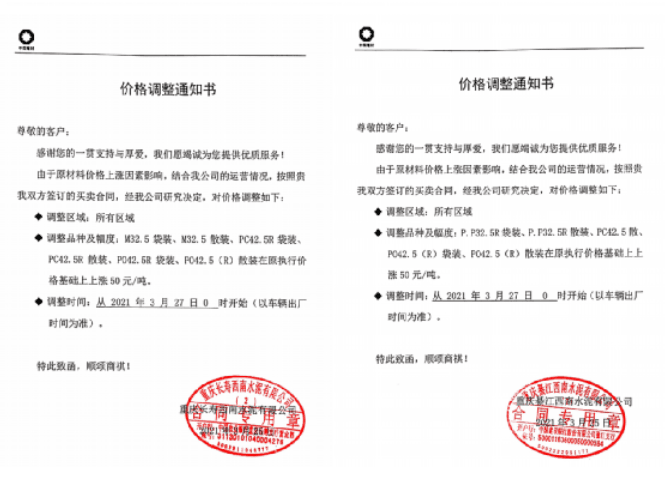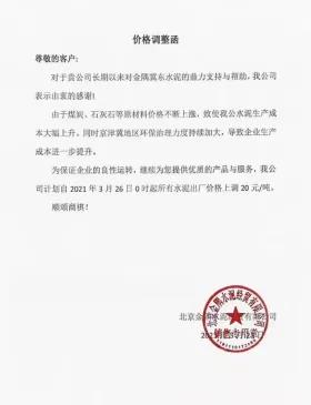 金隅冀东水泥(唐山)有限责任公司营销分公司通知,由于企业环保投入、原材料成本不断增加,致使水泥成本不断提高。为保证企业正常运营,对水泥的出厂价格进行调整,3月25日起,天津地区各品种散装水泥和袋装水泥出厂价格在原价格基础上上调20元/吨。