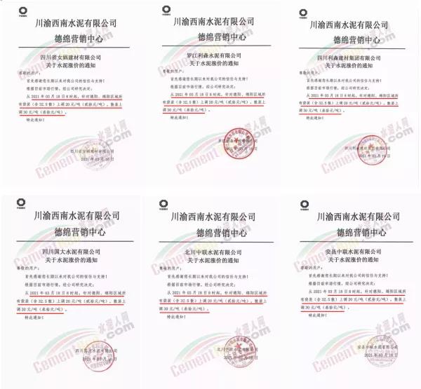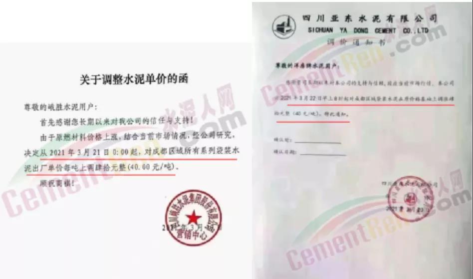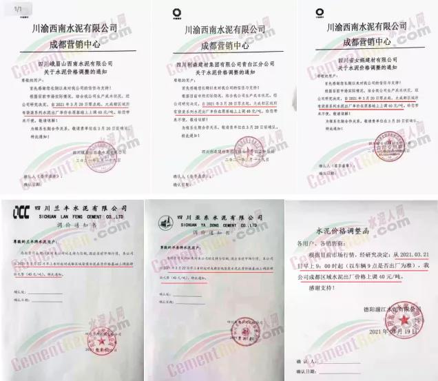 3月中旬以来四川区域西南水泥、亚东水泥、峨胜水泥等多家主要品牌企业陆续通知上调水泥价格30-40元/吨。