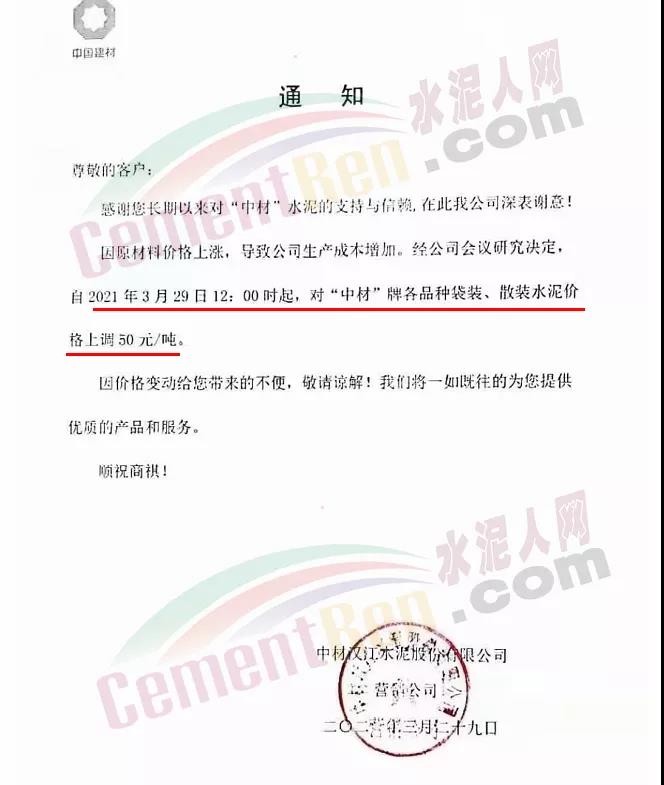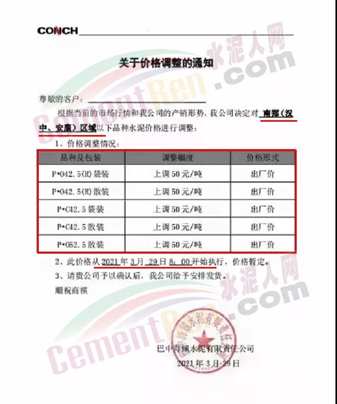 日前,巴中海螺水泥有限责任公司通知根据当前市场行情和公司的产销形势,自3月29日起对南效(汉中、安康)区域P.O42.5(R)和P.O52.5等标号包装和散装水泥出厂价上调50元/吨。