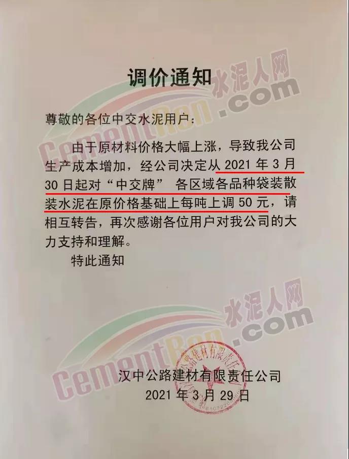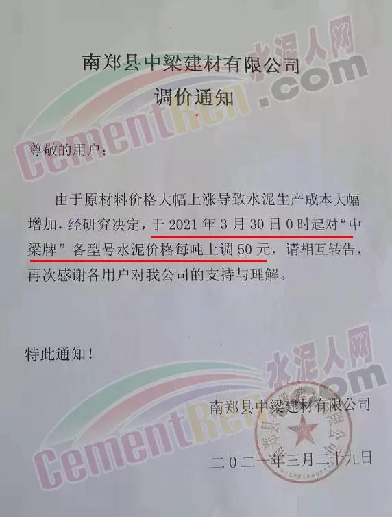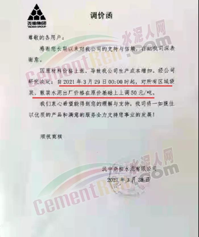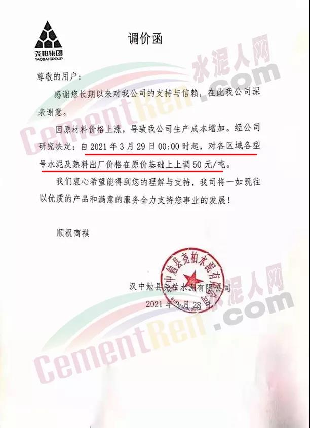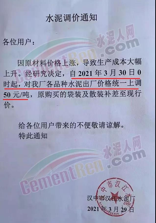 汉中尧柏水泥、汉中勉县尧柏水泥、中材汉江水泥、汉中市汉江水泥厂、南郊县中梁建材有限公司、汉中公路建材有限责任公司等多家品牌水泥企业通知,自29日起上调各标号水泥及熟料出厂价格50元/吨。