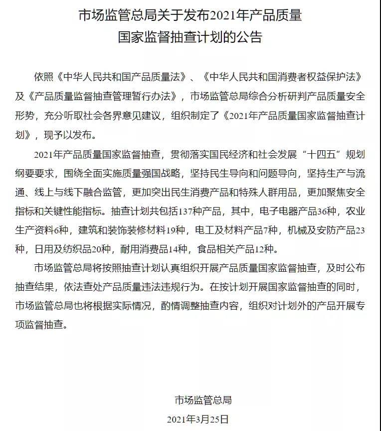 29日,市场监管总局发布了关于2021年产品质量国家监督抽查计划的公告。公告显示,《2021年产品质量国家监督抽查计划》共涉及137种产品,其中,电子电器产品36种,农业生产资料6种,建筑和装饰装修材料包括水泥产品在内共19种,电工及材料产品7种,机械及安防产品23种,日用及纺织品20种,耐用消费品14种,食品相关产品12种。
