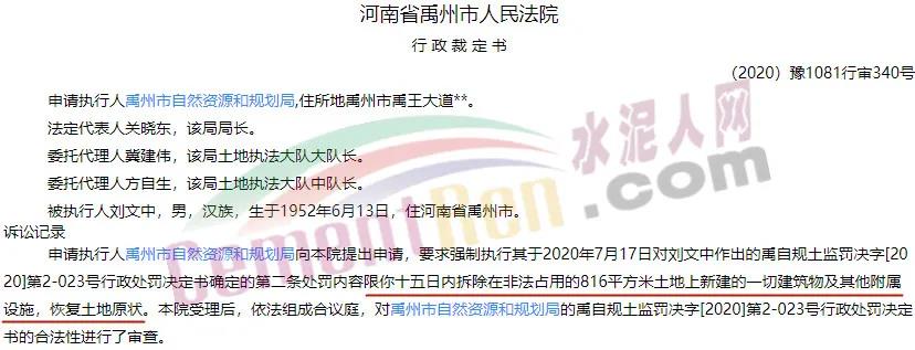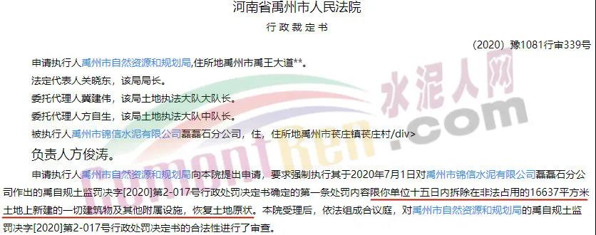 (2020)豫1081行审355号行政裁定书,准予执行禹州市自然资源和规划局对被执行人禹州市锦信水泥有限公司磊磊石分公司作出的禹自规土监罚决字[2020]第2-025号行政处罚,决定书载明第一条处罚限你单位十五日内拆除在非法占用的11556平方米土地上新建的一切建筑物及其他附属设施,恢复土地原状。由禹州市自然资源和规划局组织实施。