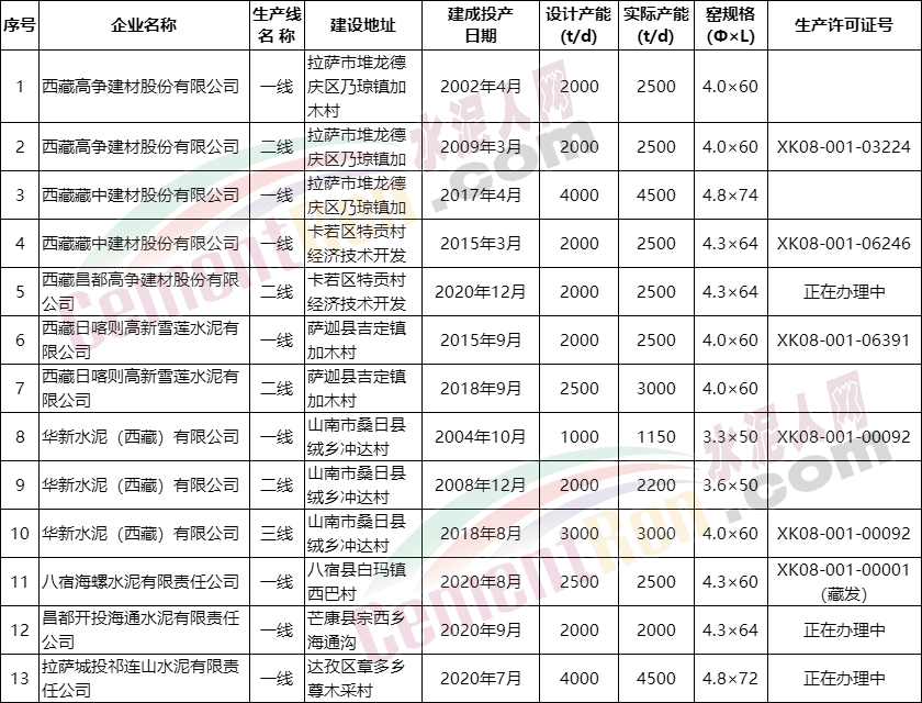 3月30日,西藏自治区经济和信息化厅发布《西藏自治区经济和信息化厅关于公开全区水泥熟料生产线清单的公告》称,根据相关文件要求,西藏自治区经信厅组织相关市经信局和水泥生产企业更新了全区水泥熟料生产线清单,并将汇总后的清单予以公告。 西藏自治区水泥熟料生产线清单显示,包括西藏高争、高新雪莲、华新西藏、八宿海螺、昌都开投海通以及拉萨城投祁连山水泥在内的13条熟料生产线,实际年产能达千万吨以上。 西藏自治区水泥熟料生产线清单 填报处室: 原材料工业处 发布时间:2021年3月25日