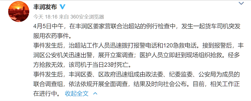 6日晚间,@丰润发布通报称,4月5日中午,在丰润区姜家营联合治超站的例行检查中,发生一起货车司机突发服用农药事件。