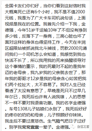 河北沧州泊头市货车司机金德强4月5日途经唐山市丰润区超限检查站时,因北斗定位掉线,被处以扣车、罚款2000元。或因不能接受此罚款,金德强服农药自杀,最终抢救无效去世。