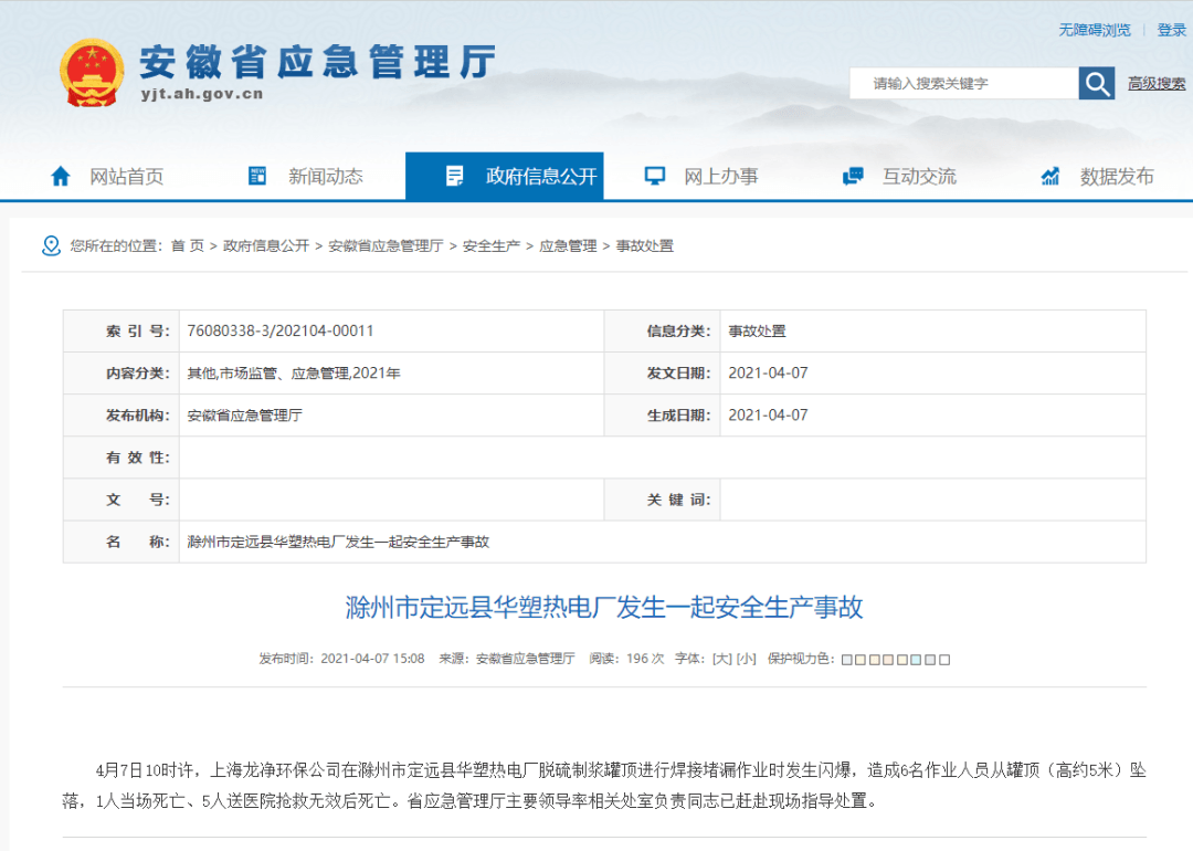 据安徽省应急管理厅官网通报,4月7日10时许,上海龙净环保公司在滁州市定远县华塑热电厂脱硫制浆罐顶进行焊接堵漏作业时发生闪爆,造成6名作业人员从罐顶(高约5米)坠落,1人当场死亡、5人送医院抢救无效后死亡。省应急管理厅主要领导率相关处室负责同志已赶赴现场指导处置。