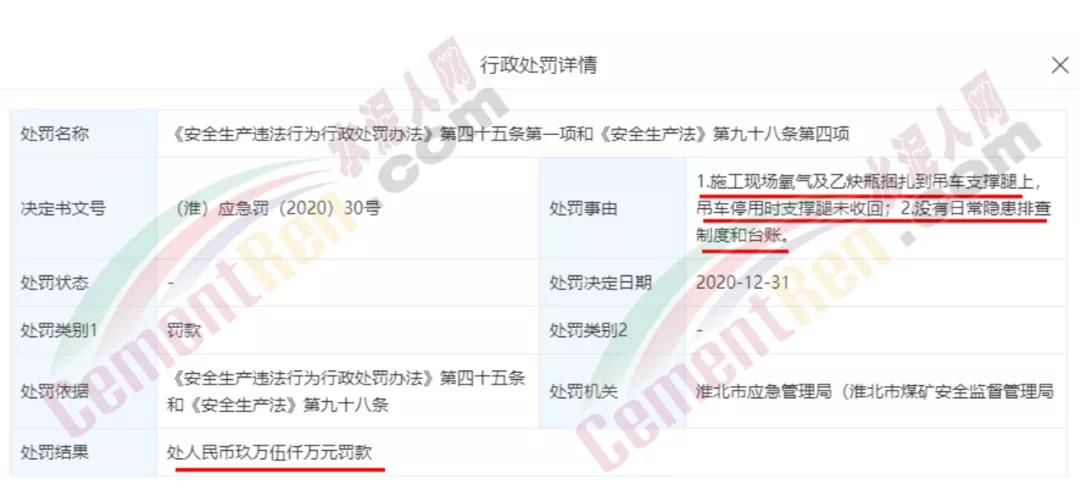 处罚日期:2020年12月31日;处罚结果:处人民币玖万伍仟万元罚款;处罚事由:1.施工现场氧气及乙炔瓶捆扎到吊车支撑腿上,吊车停用时支撑腿未收回;2.没有日常隐患排查制度和台账。