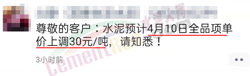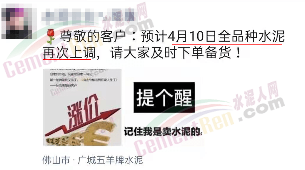 另一家企业通知,因混凝土原材料不断上涨,尤其水泥上涨了100元/吨,此举造成混凝土成本大幅攀升。经公司研究决定对混凝土售价进行调整。混凝土价格在现行结算价格上上调80元/立方。起调日期为4月12日0时。