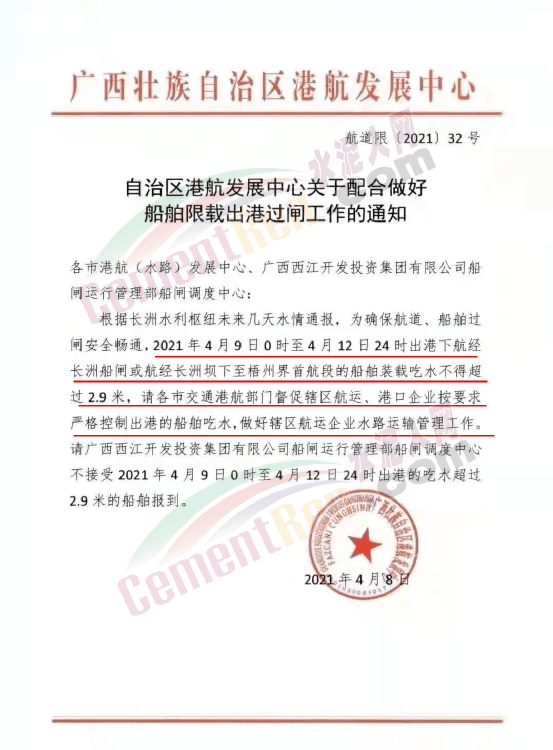 据水泥人网了解,4月8日广西壮族自治区港航发展中心发布《自治区港航发展中心关于配合做好船舶限载出港过闸工作的通知》给各市港航(水路)发展中心、广西西江开发投资集团有限公司船闸运行管理部船闸调度中心称: