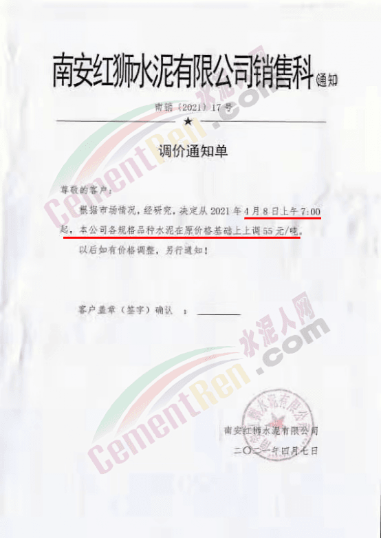 福建水泥股份有限公司南平南销售区域通知,自20 21年4月9日零时起,公司各生产基地发往南平南区域各品种、袋散装水泥的出厂含税价,在原有价格基础上上调40元/吨。