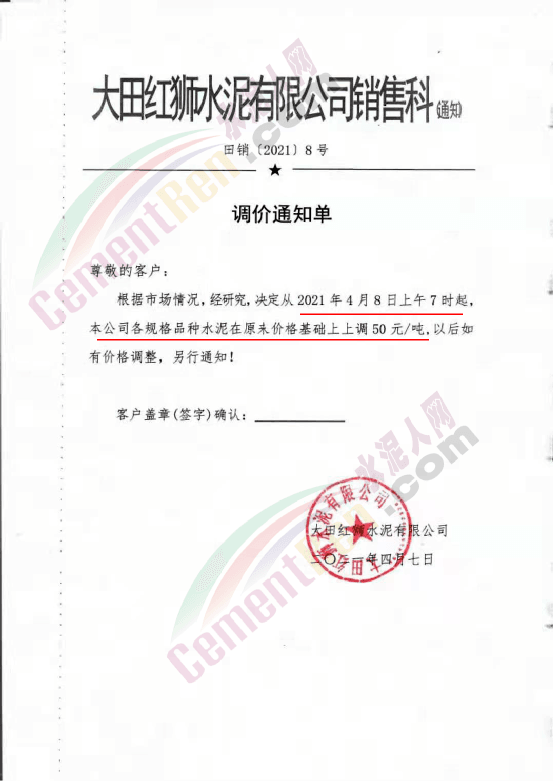 大田红狮水泥通知自4月8日上午7时起,各规格品种水泥在原价基础上上调50元/吨。