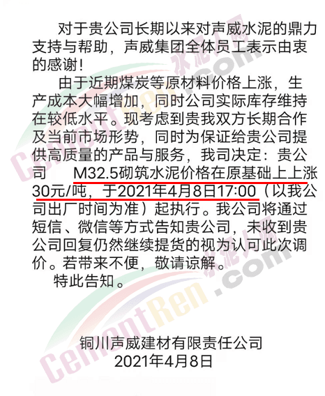 8日,铜川声威建材有限责任公司通知由于近期煤炭等原材料价格上涨,生产成本大幅增加,同时公司实际库存维持在较低水平。4月8日17时起,M32.5砌筑水泥价格在原基础上上涨 30元/吨。