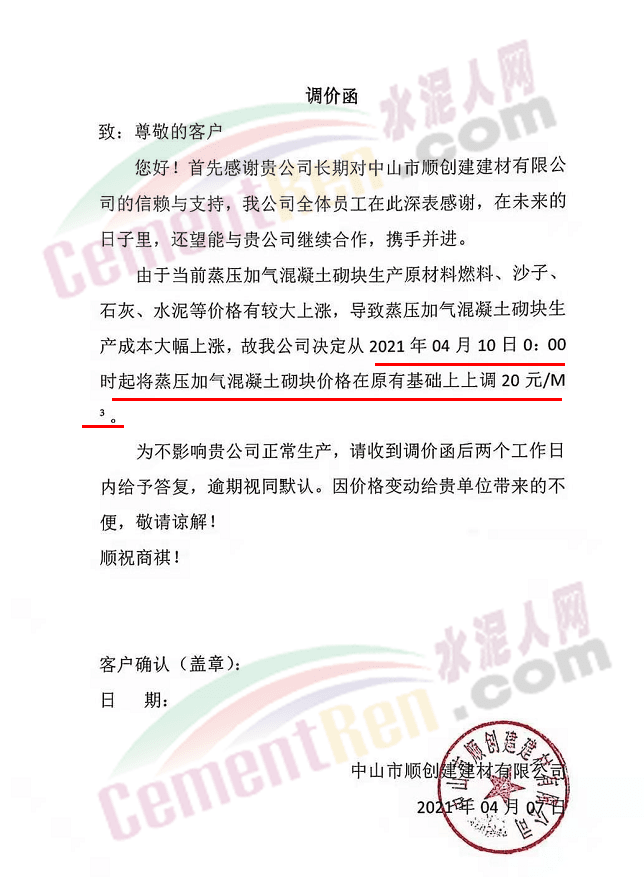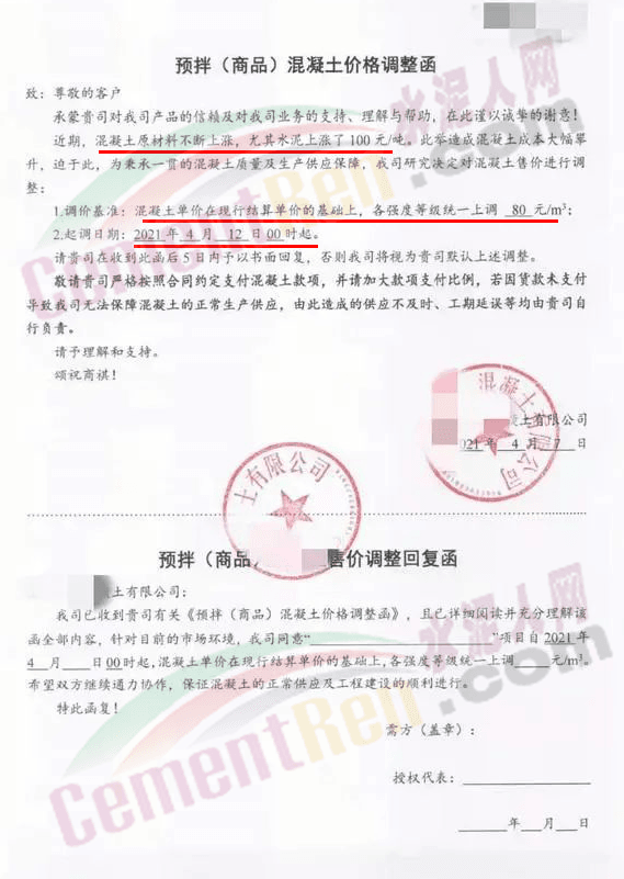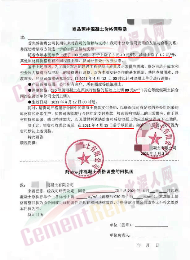 其中一家企业通知称随着今年水泥单价上涨了100元/吨,石子上涨了5 元-10元/吨,油价上涨了1-2元/升,其他原材料价格也有不同程度上涨,公司经营处于亏损状态。鉴于上述原因,为了满足客户的建设工程混凝土质量及正常供应需求。公司迫于成本和资金压力拟将商品混凝土的价格进行调整。双方本着友好合作的基本原则,共同克服困难、共演难关。经公司慎重研究决定,自 2021年4月 12 日 0时起针对混凝土单价进行调整∶