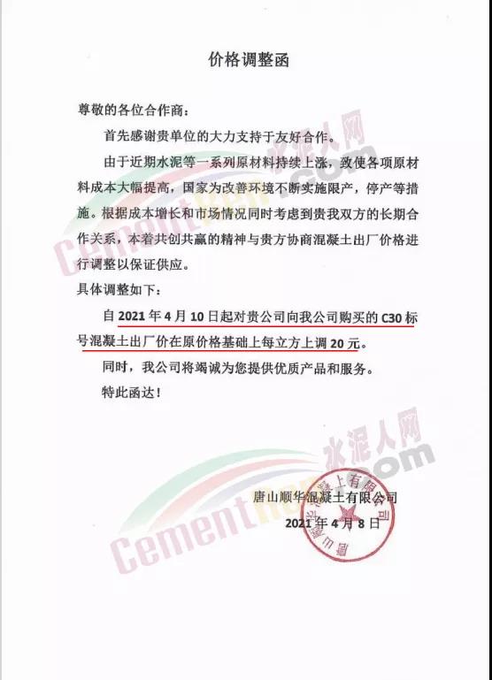 唐山顺华混凝土有限公司通知,由于近期水泥等一系列原材料持续上涨,致使各项原材料成本大幅提高,自 4月 10 日起C30标号混凝土出厂价在原价格基础上每立方上调20元。