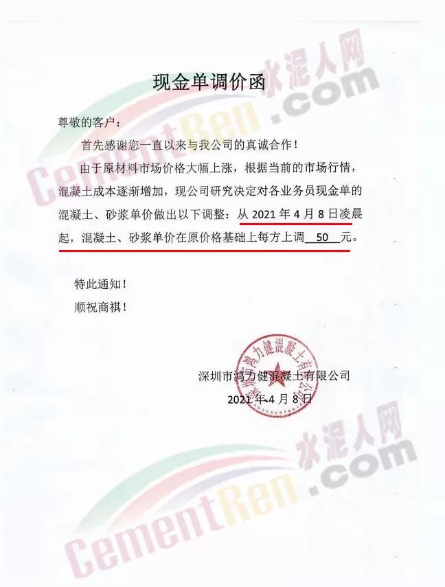 深圳市鸿力健混凝土有限公司通知由于原材料市场价格大幅上涨,混凝土成本逐渐增加,经公司研究决定对各业务员现金单的混凝土、砂浆单价做出调整。从4月8日凌晨起混凝土、砂浆在原价基础上上调50元/方。