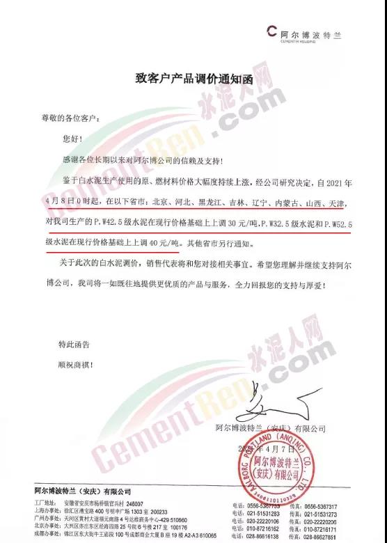 阿尔博波特兰(安庆)公司通知鉴于自水泥生产使用的原、燃材料价格大幅度持续上涨,经公司研究决定,自4月8日0时起,在北京、河北、黑龙江、吉林、辽宁、内蒙古、山西、天津,对公司生产的P.W42.5级水泥在现行价格基础上上调30元/吨,P.W32.5 级水泥和P.W52.5级水泥在现行价格基础上上调 40 元/吨。