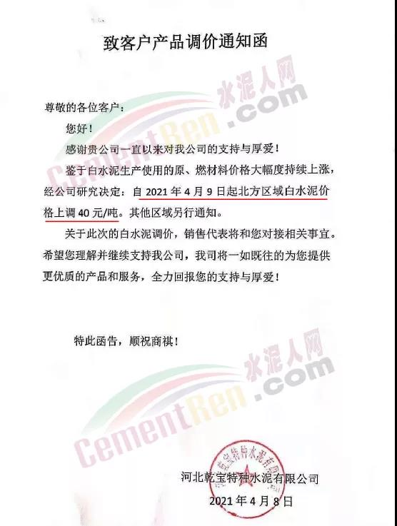 河北乾宝特种水泥通知,自4月9日起北方区域白水泥价格上调40元/吨。其他区域另行通知。
