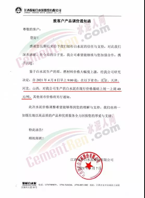 银杉白水泥通知4月8日早9时起,北京、天津、河北、山西区域白水泥价格统一上调40元/吨。