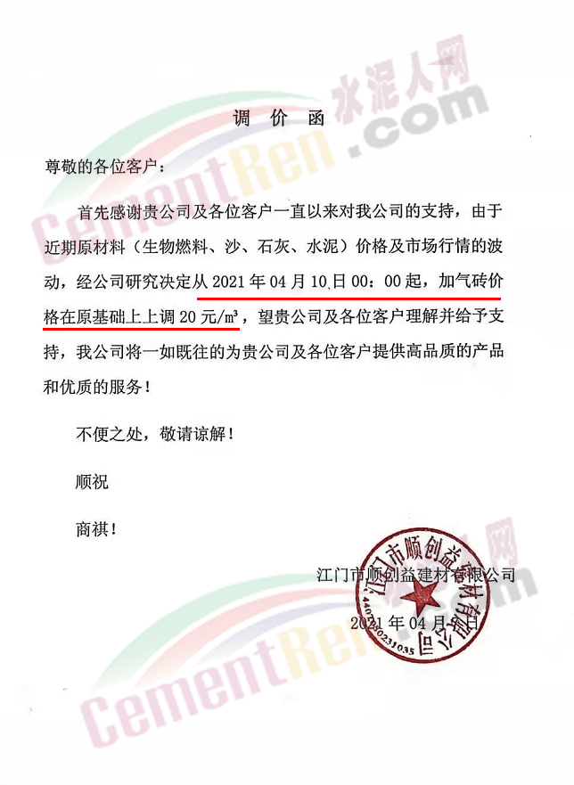 江门市顺创益建材有限公司通知从4月10日零时起,加气砖价格在原基础上上调20元/立方。