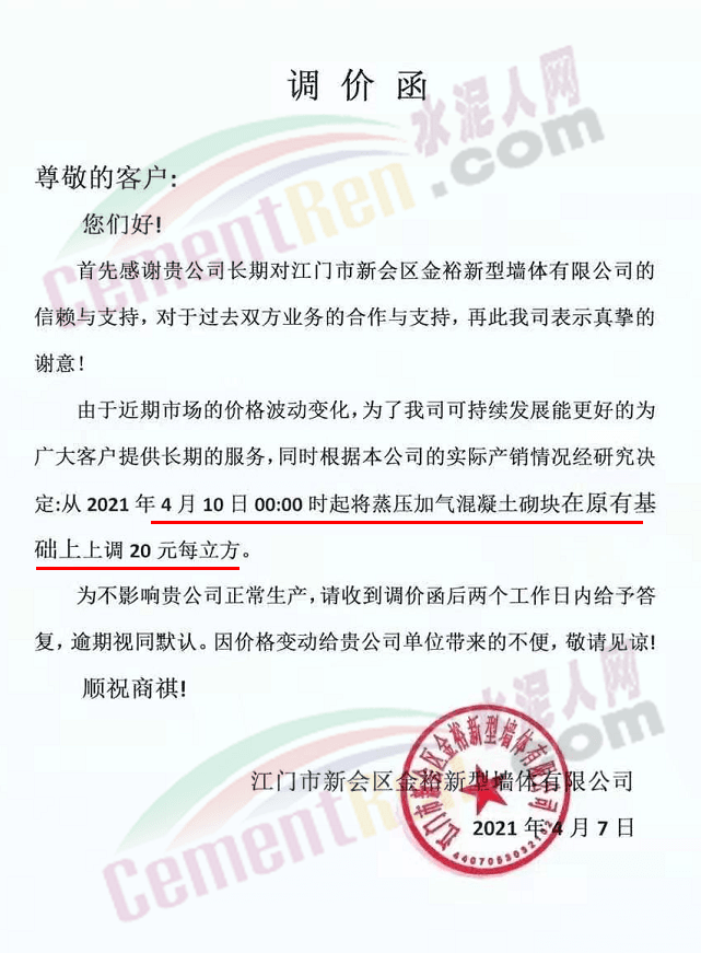 江门市新会区金裕新型墙体有限公司通知自4月10日零时起将蒸压加气混凝土砌块在原有基础上上调20元/立方。