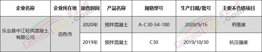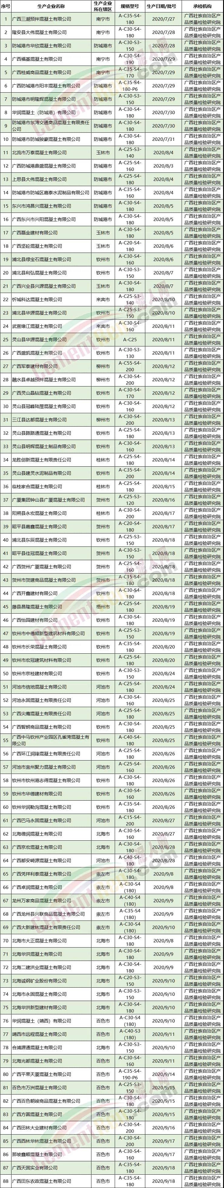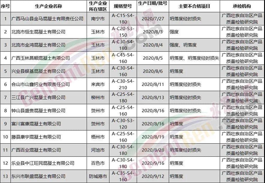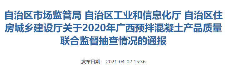 近日,广西壮族自治区市场监管局、广西壮族自治区工业和信息化厅、广西壮族自治区住房城乡建设厅联合发布《关于2020年广西预拌混凝土产品质量联合监督抽查情况的通报》。通报显示,2020年共抽取广西101家预拌混凝土企业生产的101批次产品,经检验, 合格产品88批次,不合格产品13批次,不合格产品检出率为12.9%。不合格项目涉及 坍落度、坍落度经时损失、抗压强度。