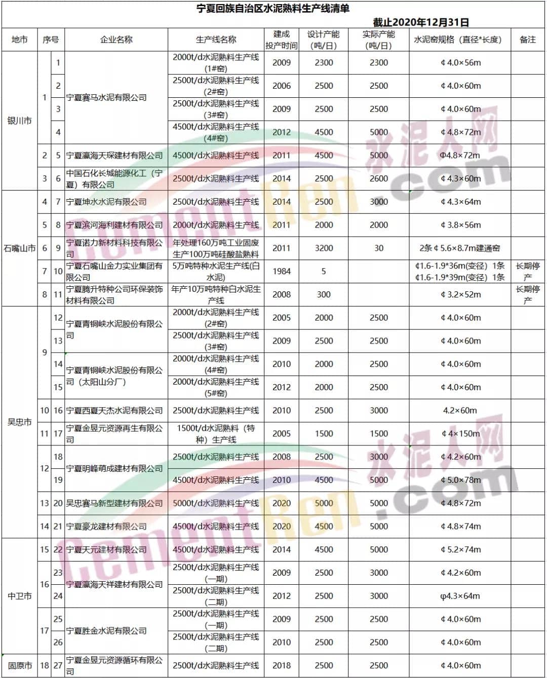 日前,宁夏回族自治区工业和信息化厅公开了全区水泥熟料生产线清单截止时间为2020年12月31日。清单显示,宁夏回族自治区18家水泥企业27条熟料生产线,合计产能达2277.9万吨。 其中宁夏石嘴山金力实业集团有限公司5万吨特种水泥生产线(白水泥)和宁夏腾升特种公司环保装饰材料有限公司年产10万吨特种白水泥生产线长期停产。 (点开图片放大浏览)